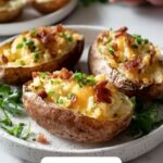 For a fun twist, turn these baked potatoes into loaded “potato skins” by scooping out some of the interior, mixing it with cheese and toppings, then returning the filling for an extra melty, crispy treat. Or serve them halved on a colorful platter garnished with herbs for a casual yet polished look.