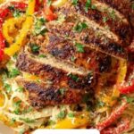 Using the same skillet, add the remaining olive oil and a pat of butter. Once melted, toss in the minced garlic and sauté until it becomes fragrant—this usually takes about a minute but fills your kitchen with an irresistible aroma. Add the julienned red and yellow bell peppers, cooking them just long enough for them to soften but still retain a delightful crunch and burst of color. This step adds a fresh, sweet balance to the savory spice of the chicken.